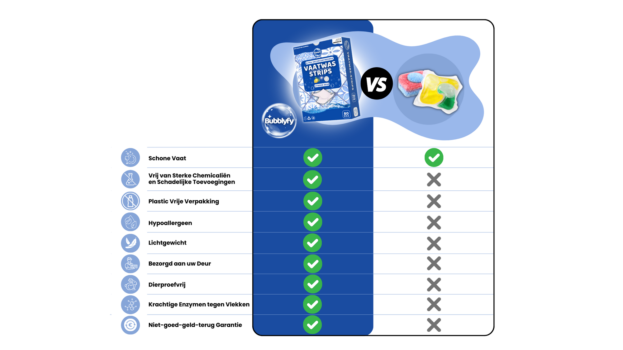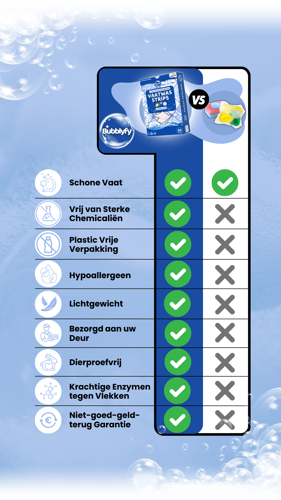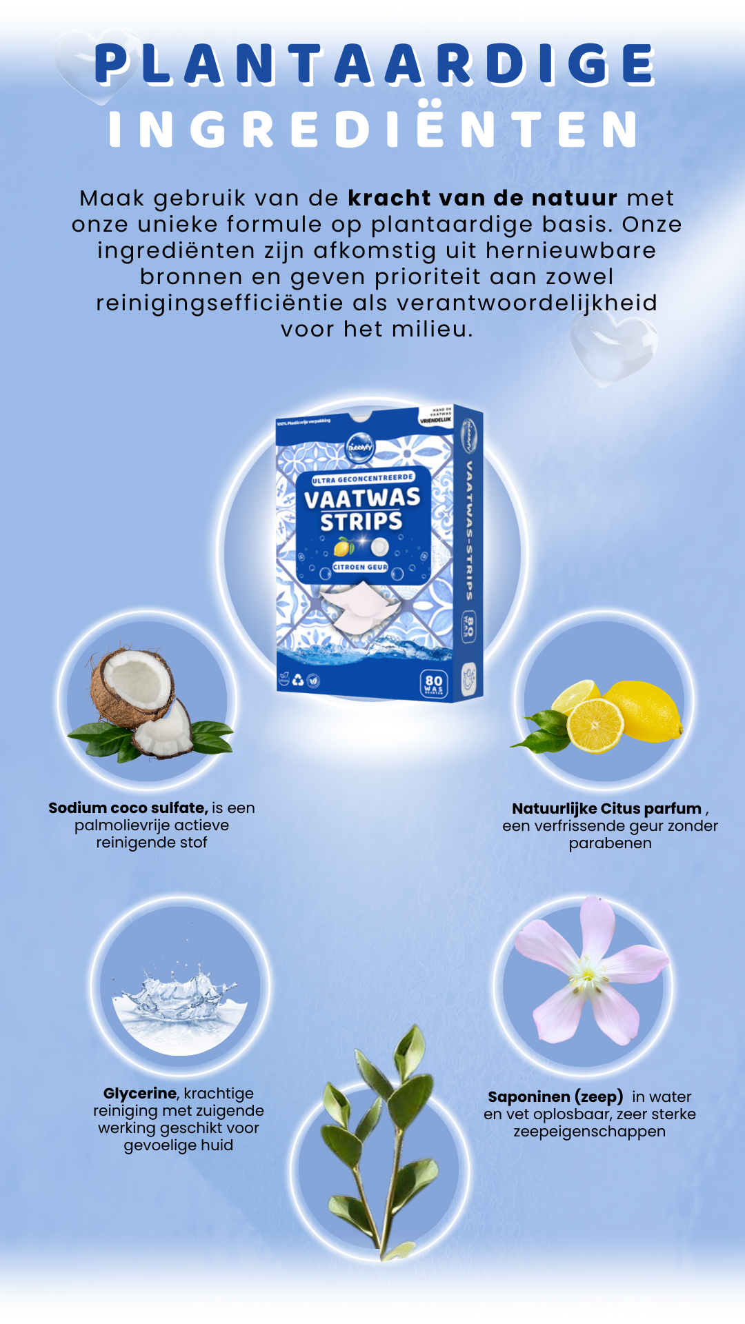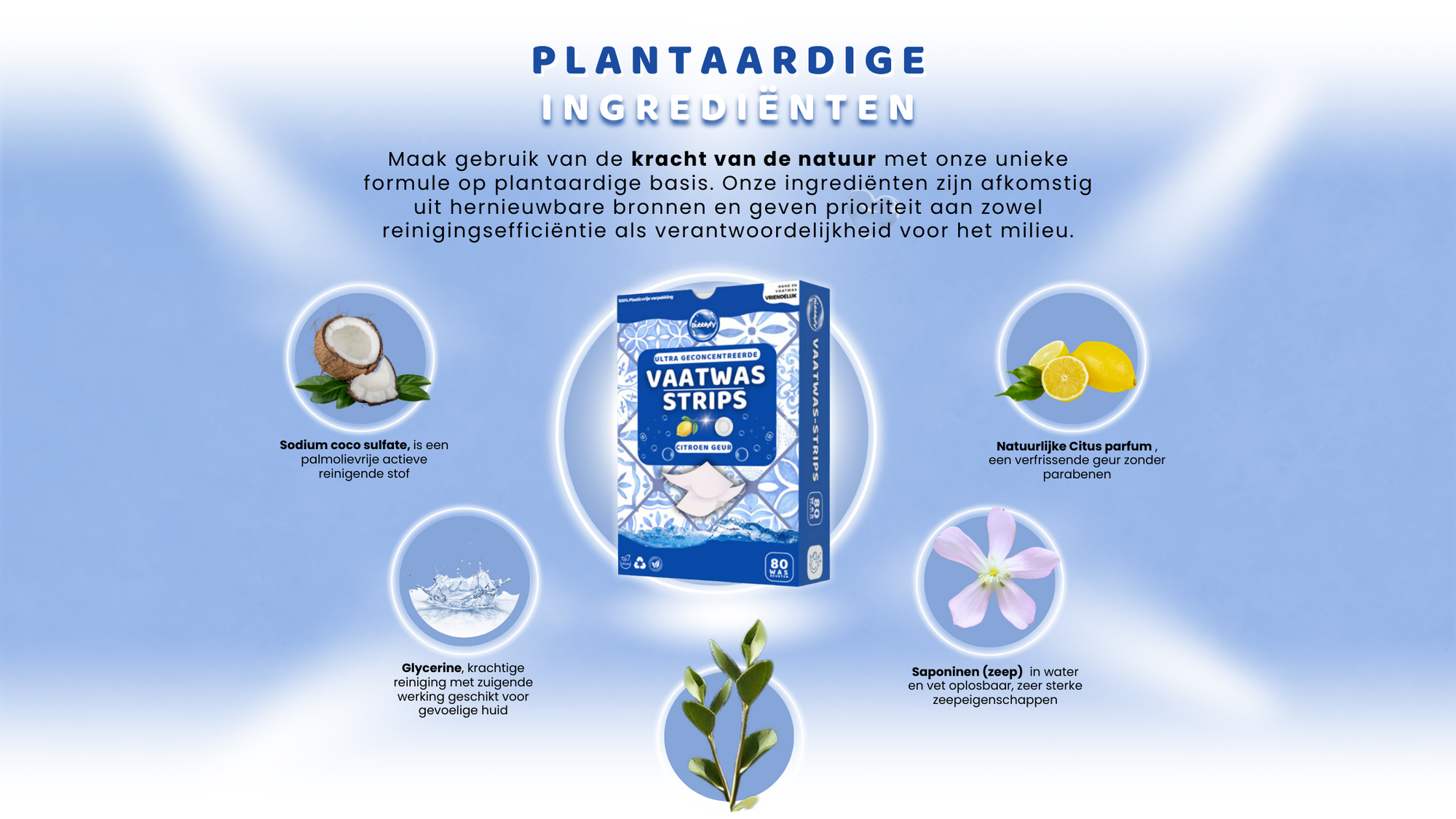 Door te kiezen voor onze vaatwasstrips neem je niet alleen afscheid van grote plastic verpakkingen, maar kies je ook voor een plantaardige schoonmaakoplossing.